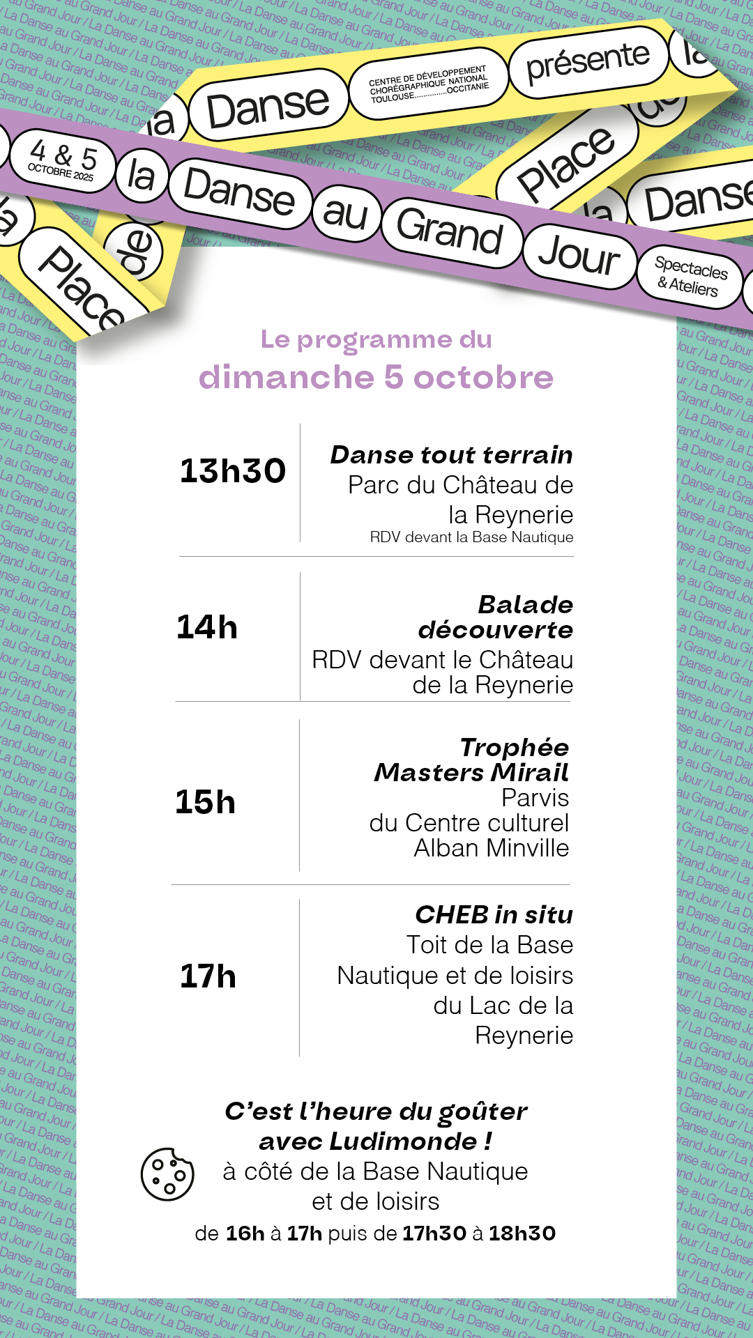 Et alors que surgiront les impromptus de FIDIA DIALA & FREDDY MOREZON, vous apprendrez que la DANSE TOUT TERRAIN existe bel et bien, vous encouragerez les participant·e·s du TROPHÉE MASTERS MIRAIL et vous arpenterez La Reynerie guidé·e·s par l'association EN QUÊTE DE PATRIMOINE.